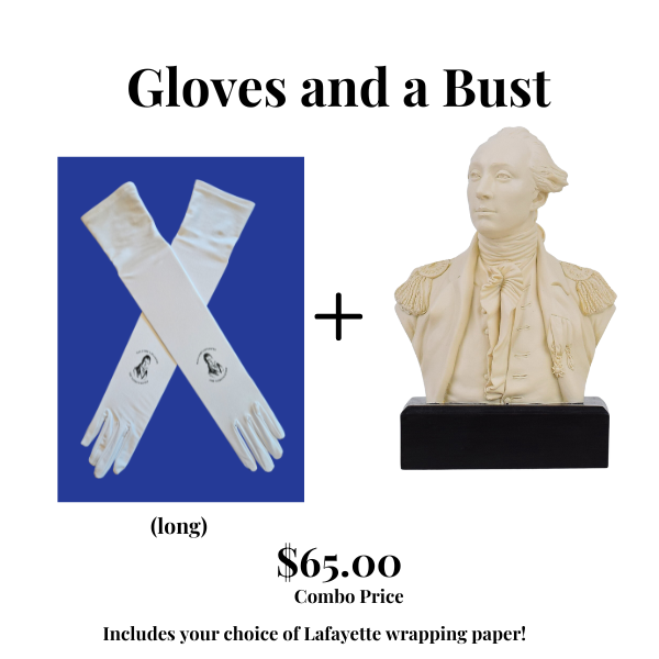 Each combo includes one pair of white stretch matte finish Lafayette gloves. The gloves have Lafayette's image printed on them. There are long white gloves for evening and balls, and short white gloves for the daytime and less formal attire. Each combo also includes a 6-inch Lafayette souvenir bust. This is a high-quality, elegant, and timely gift for 2024!