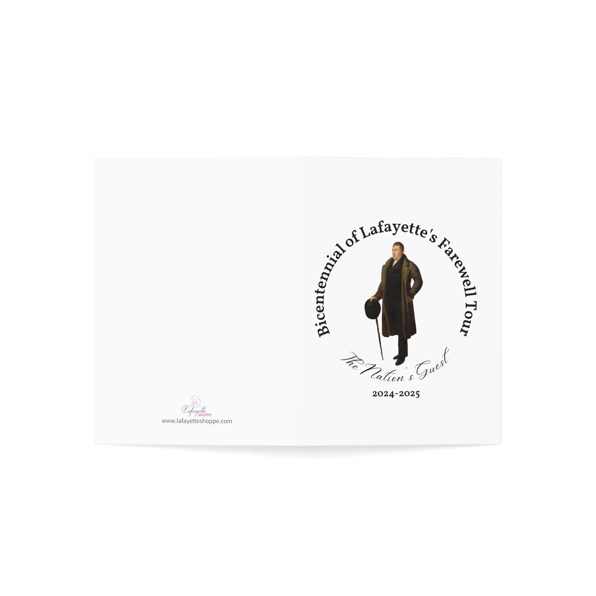 Lafayette greetings cards are the perfect addition to your stationery! These blank cards feature an 1820's portrait of Lafayette in an emblem that celebrates the 200th anniversary of Lafayette's return to America in 2024-2025 on the cover.