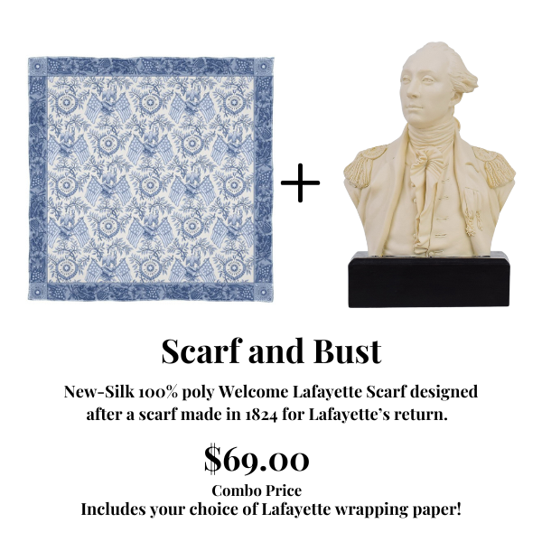 Each combo includes a blue and white Welcome Lafayette scarf fashioned after a scarf from 1824 during Lafayette's Tour of the US. And, each combo includes a 6-inch Lafayette souvenir bust. This is a beautiful and timely gift for 2024!