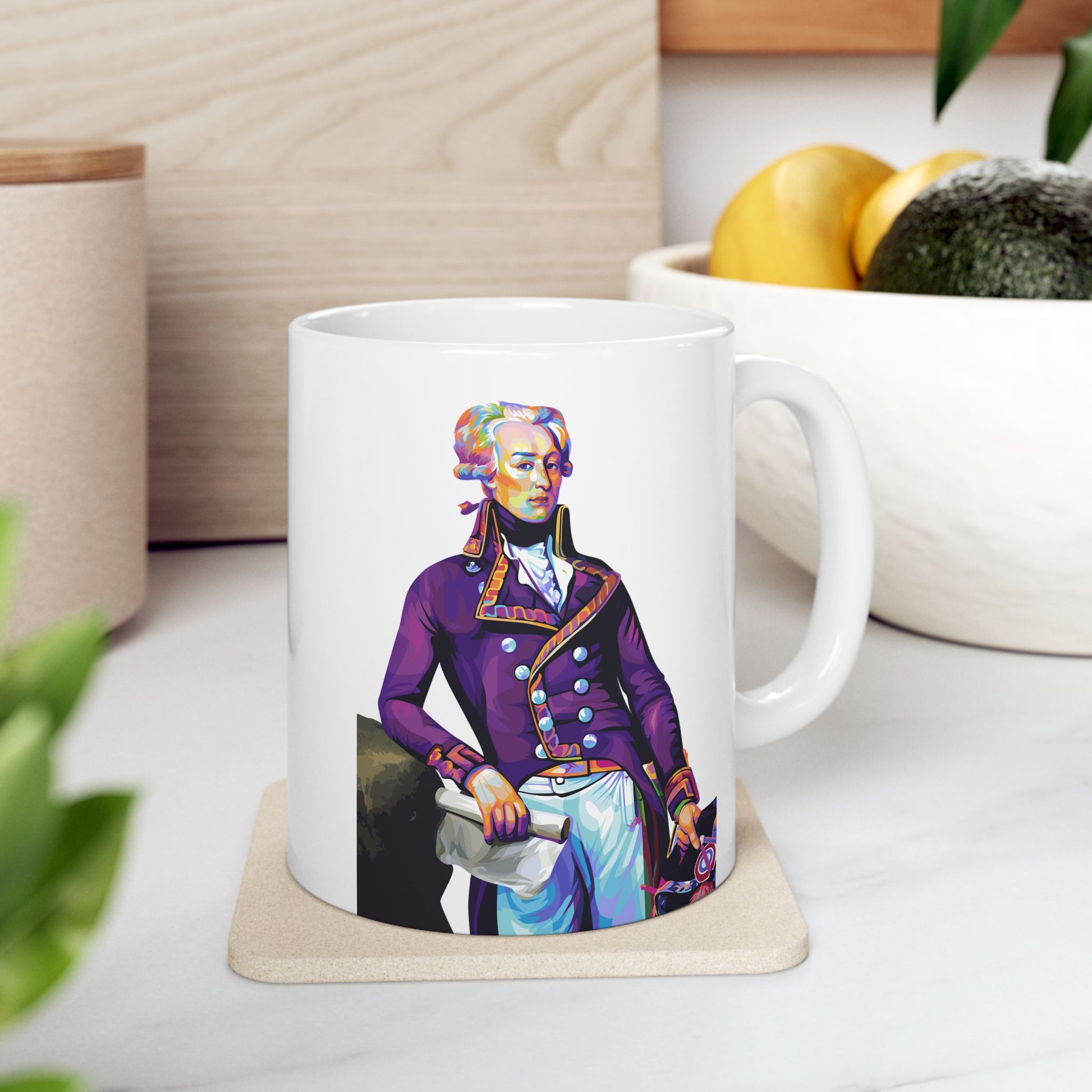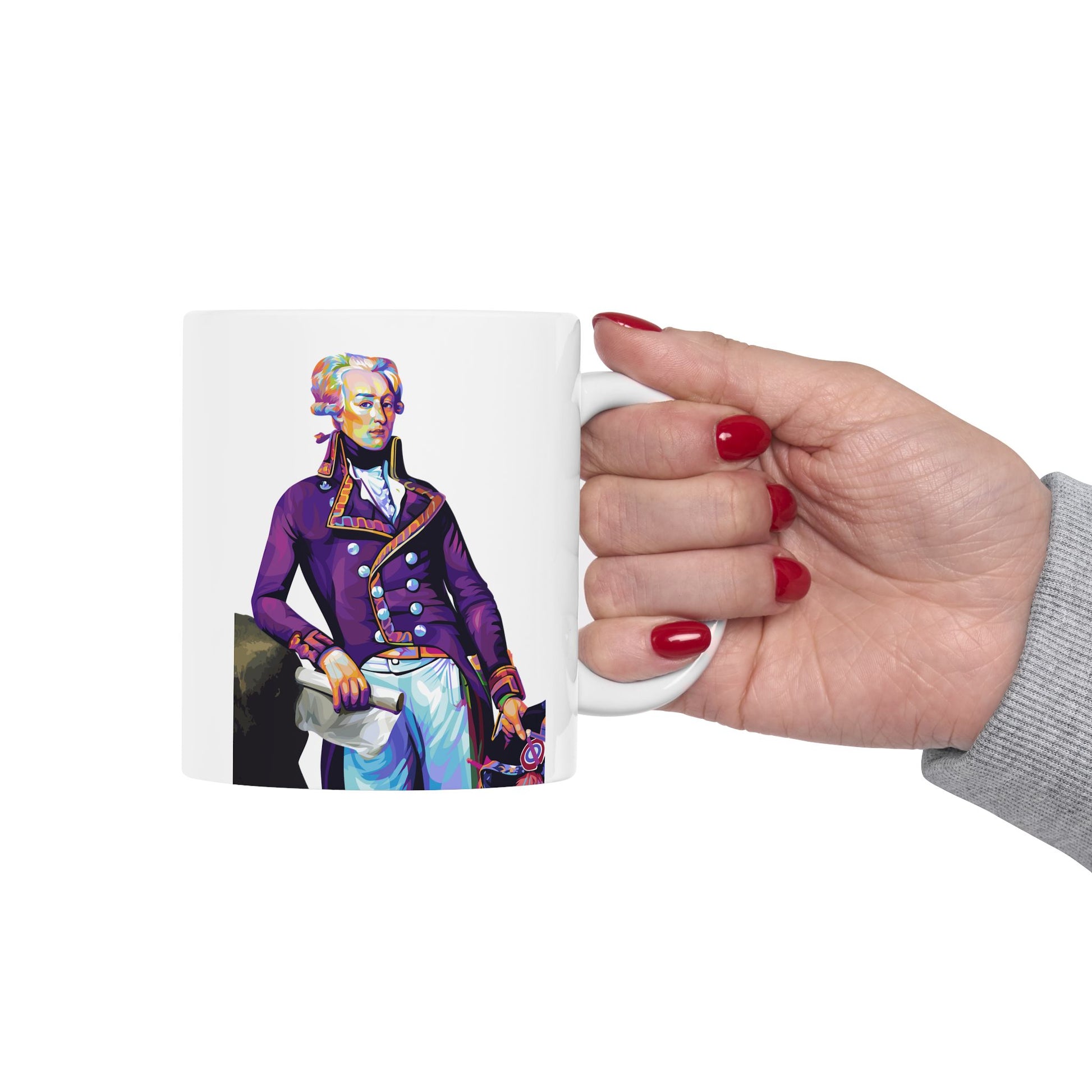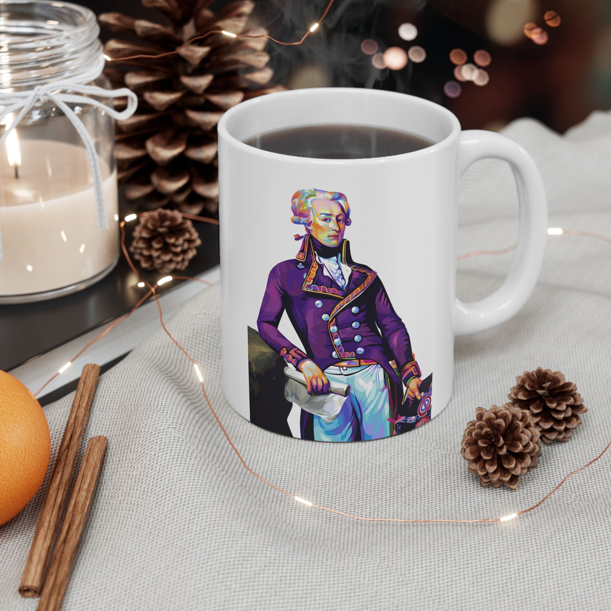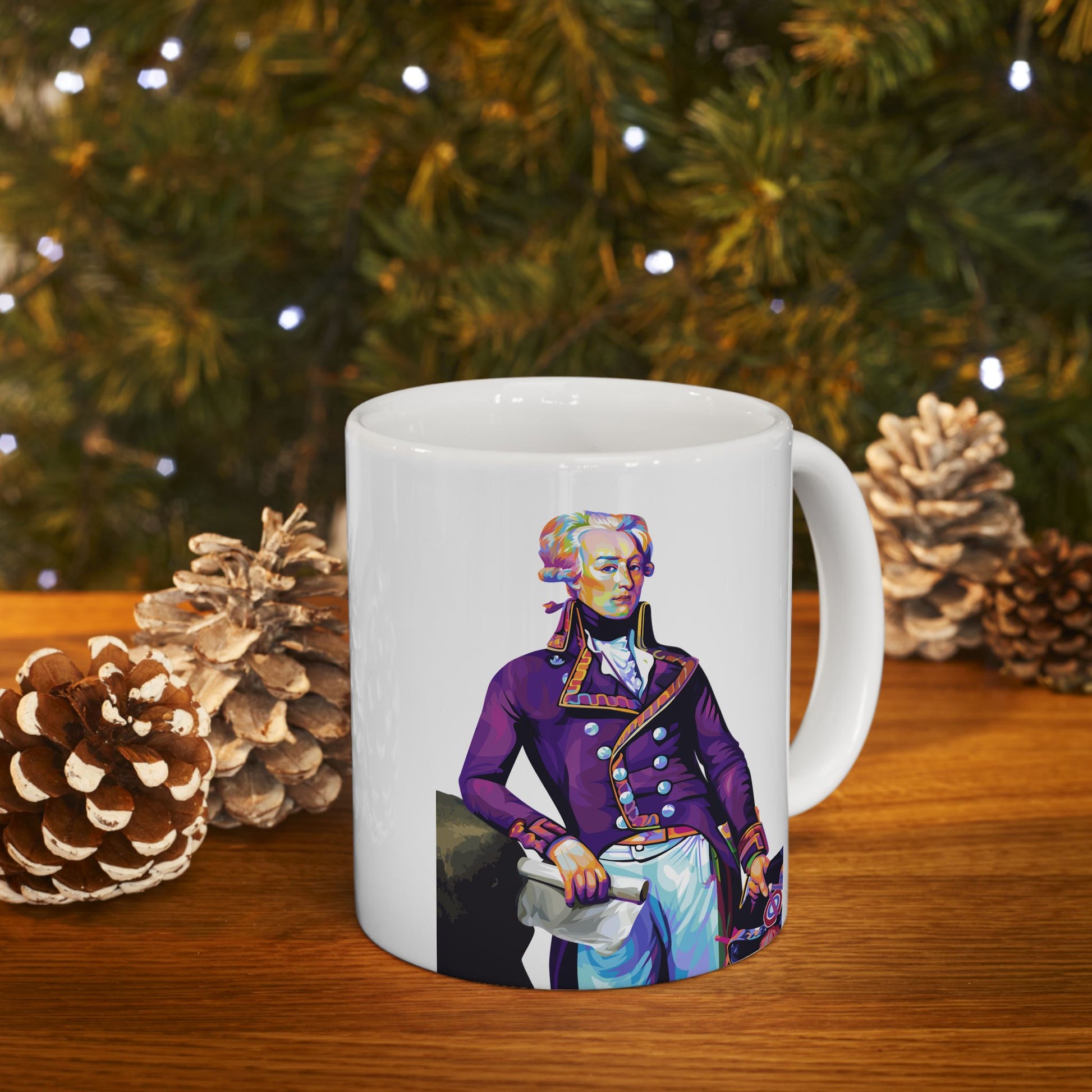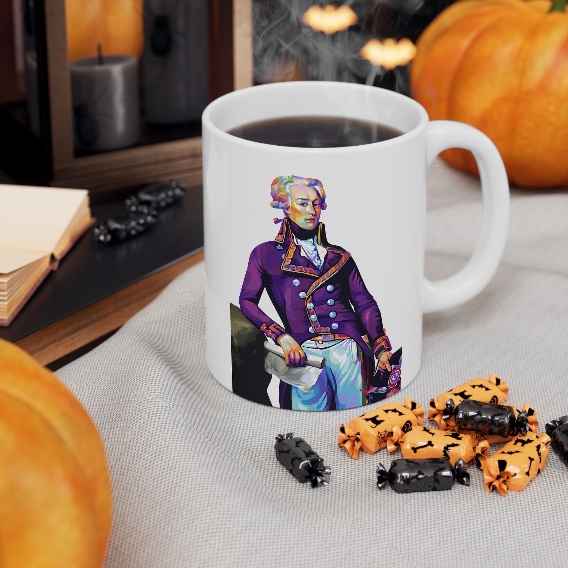 The mug is BPA and lead-free, microwave & dishwasher-safe, and made of white, durable ceramic in an 11-ounce size. Printed with vivid colors. This is a must for any history buff or any fan of the Marquis de Lafayette.