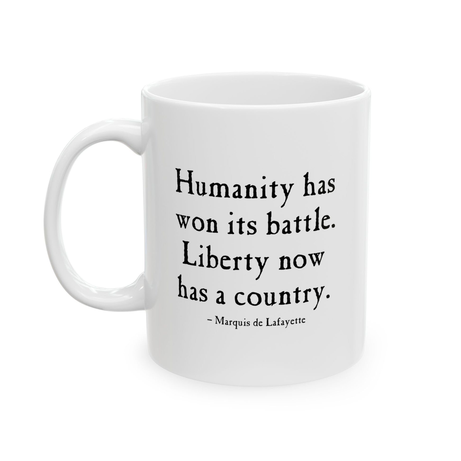 Marquis de Lafayette Quote on 11oz White Ceramic Mug. Humanity has won it's battle. Liberty now has a country.