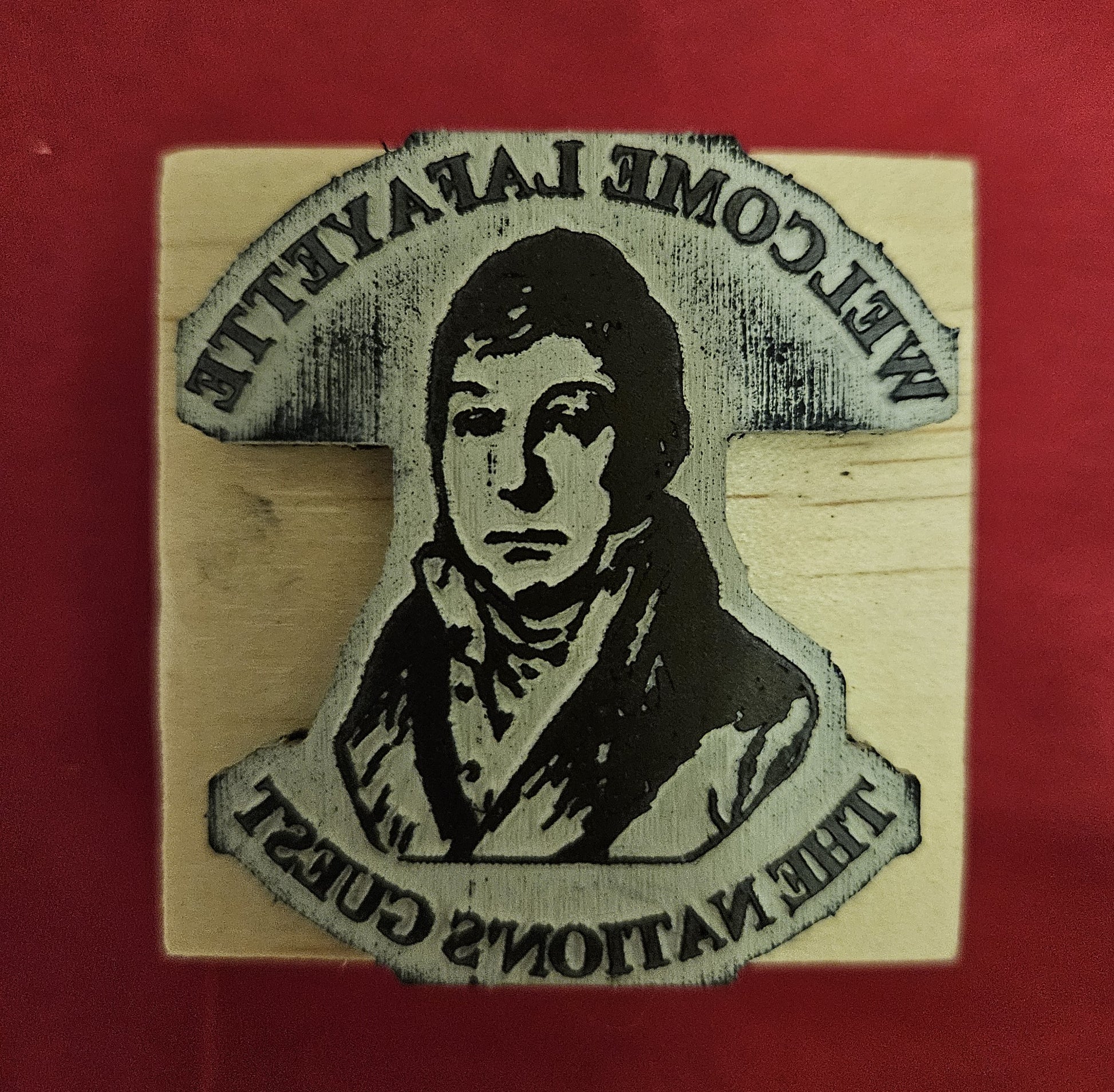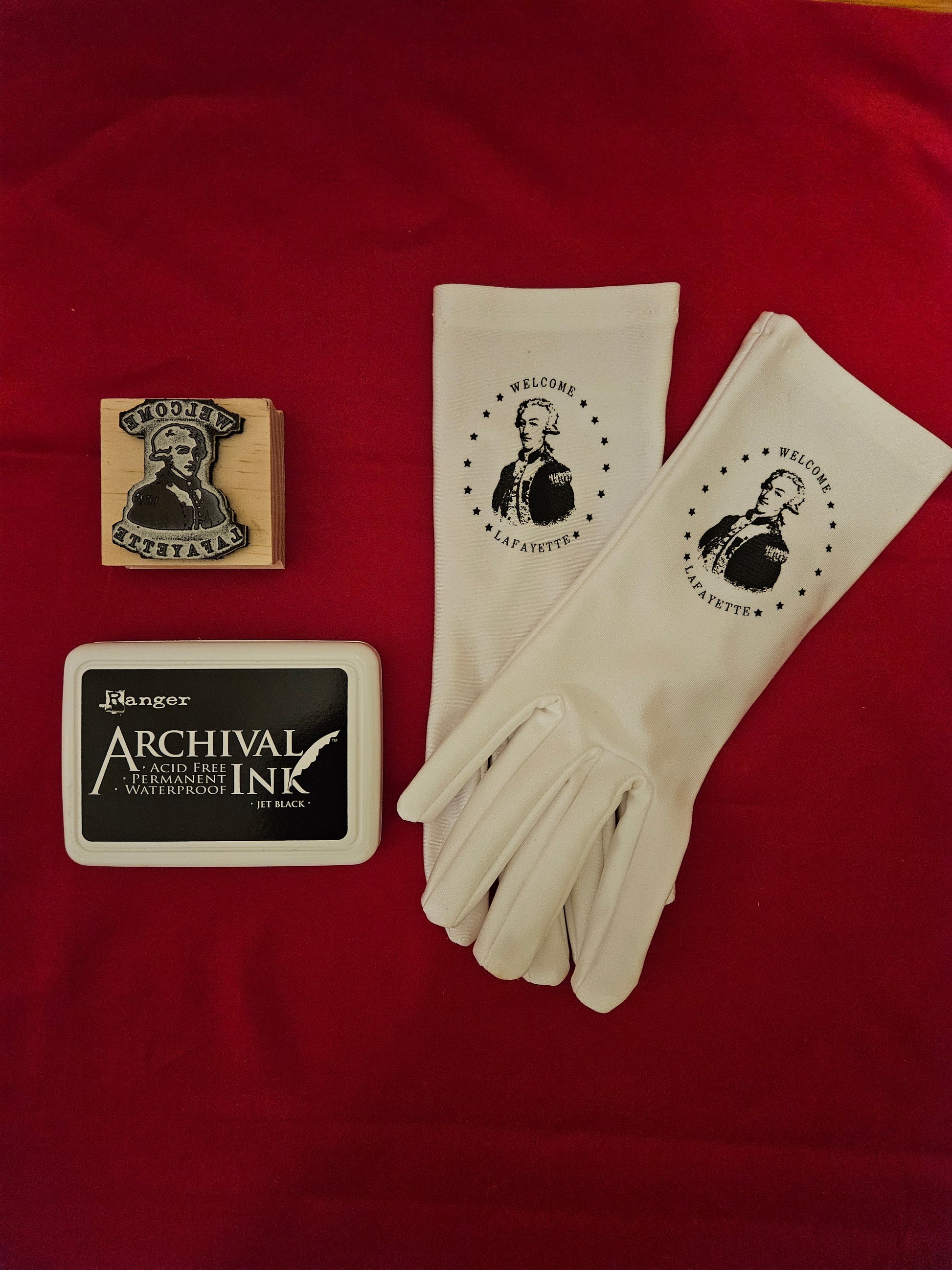 Get these Welcome Lafayette rubber stamps today and stamp your gloves of any fabric or any length you want with Lafayette's image. There are two styles to choose from - Young Lafayette with the words "Welcome Lafayette" and 1820's older Lafayette with the words "Welcome Lafayette The Nation's Guest".