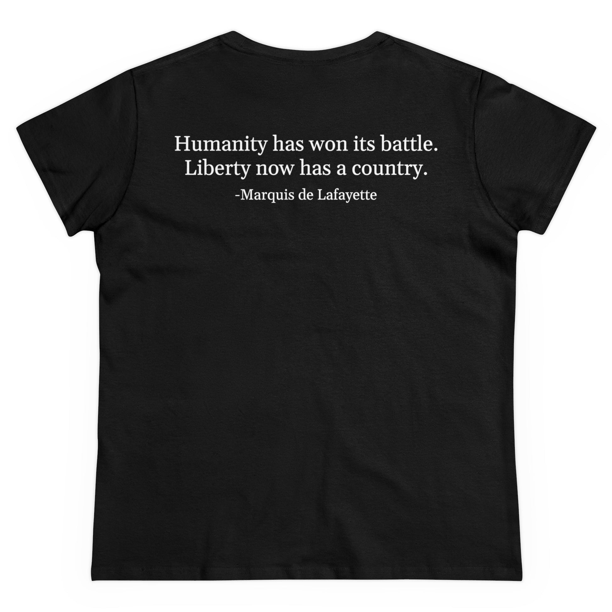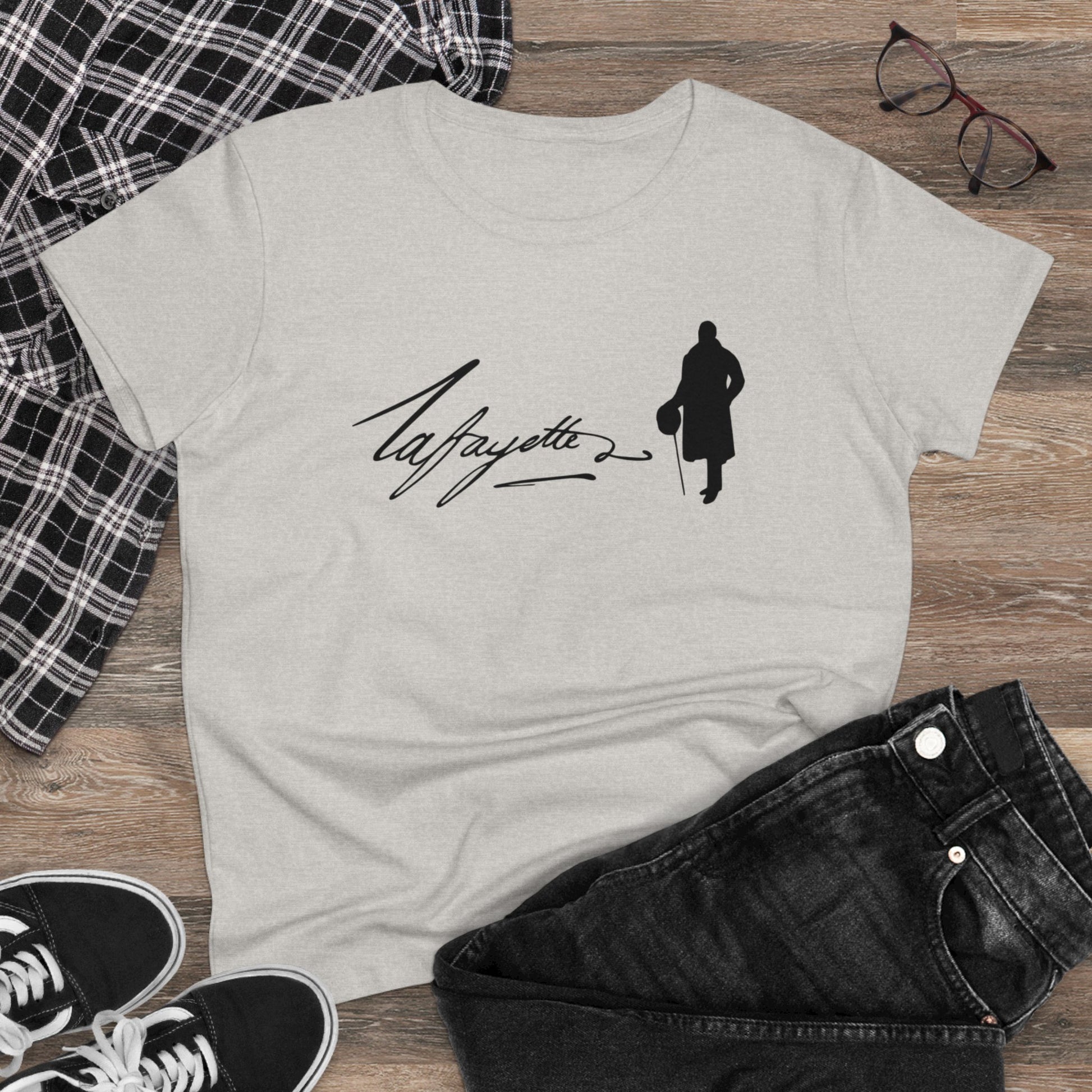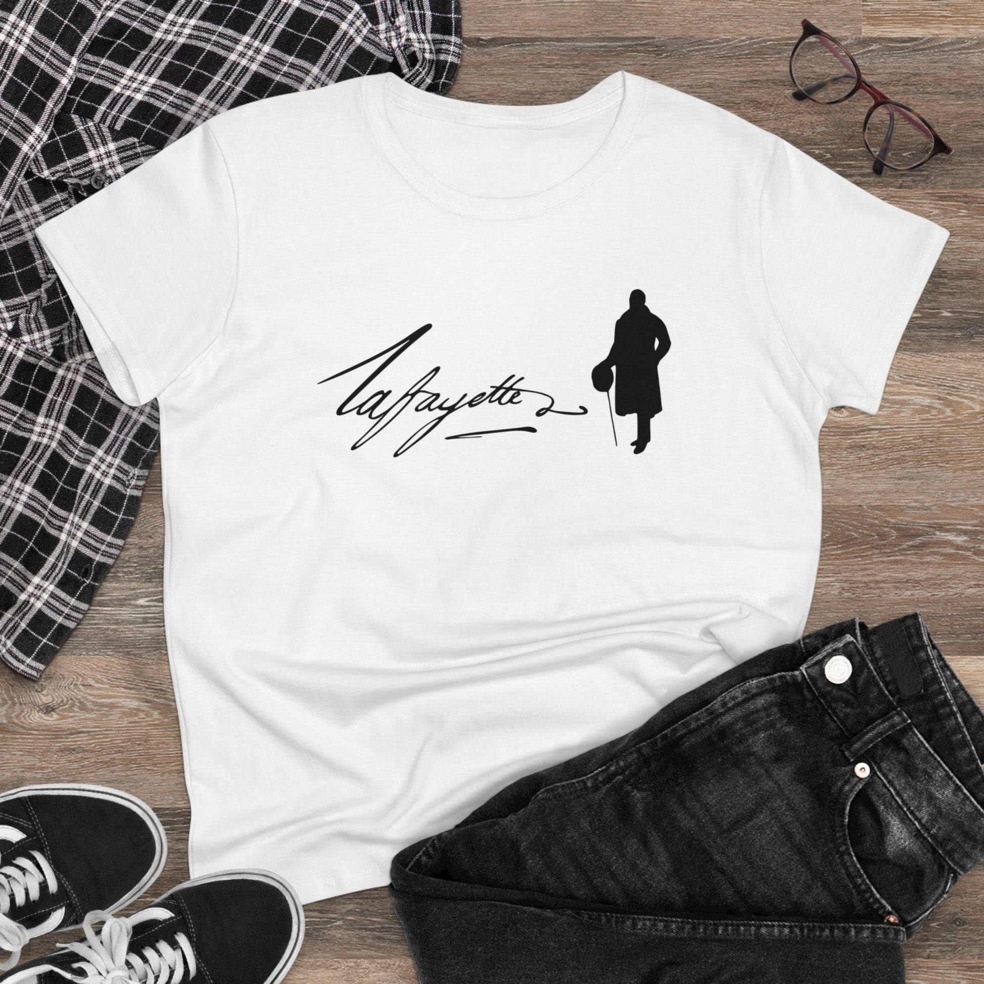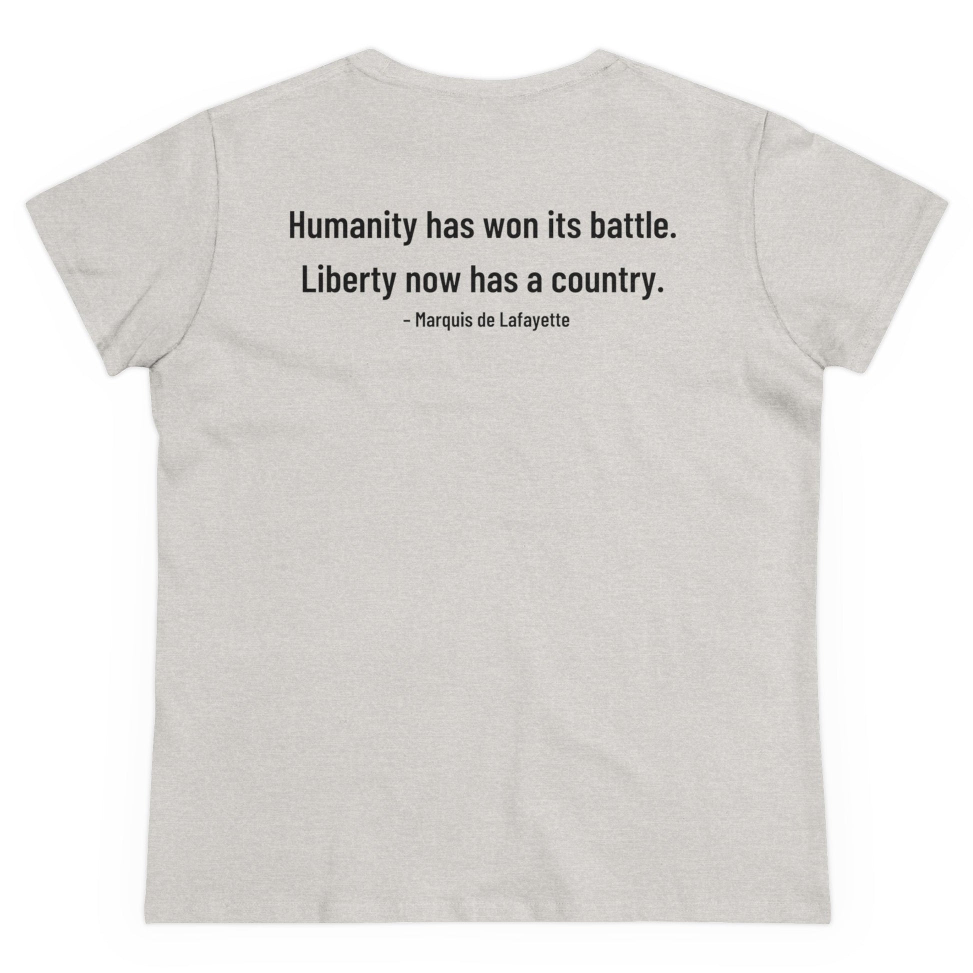 Two-sided Lafayette Women's Tee Silhouette Signature Cap Sleeves Midweight Cotton - Slightly Fitted - Quote on Back, Bicentennial, Marquis