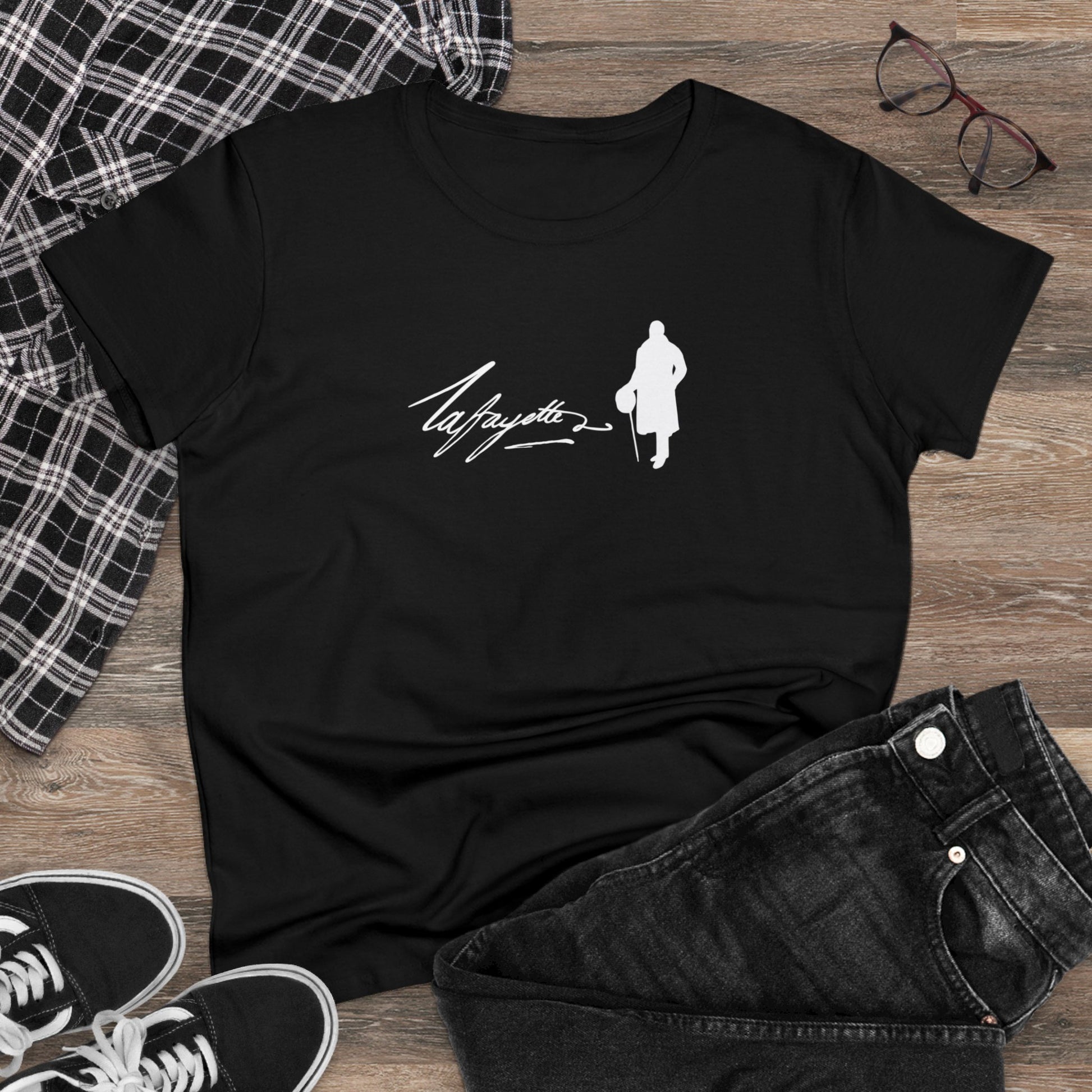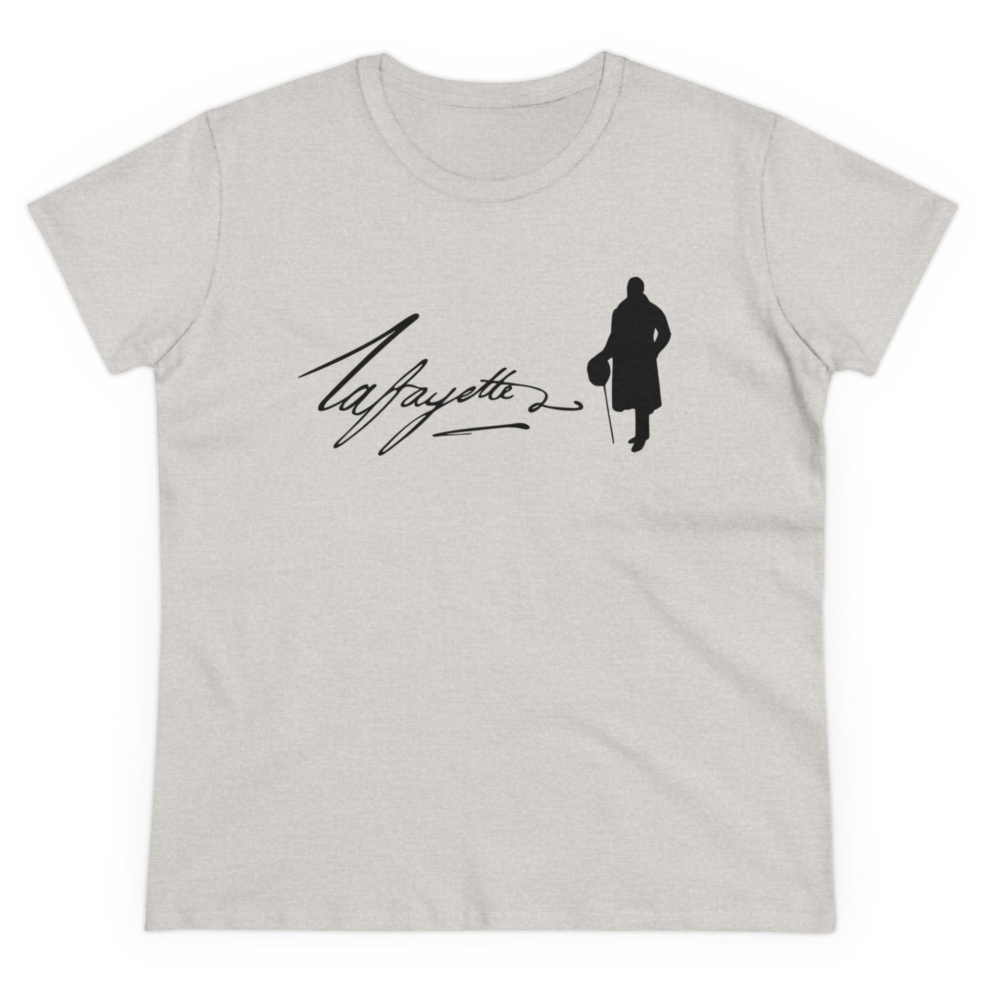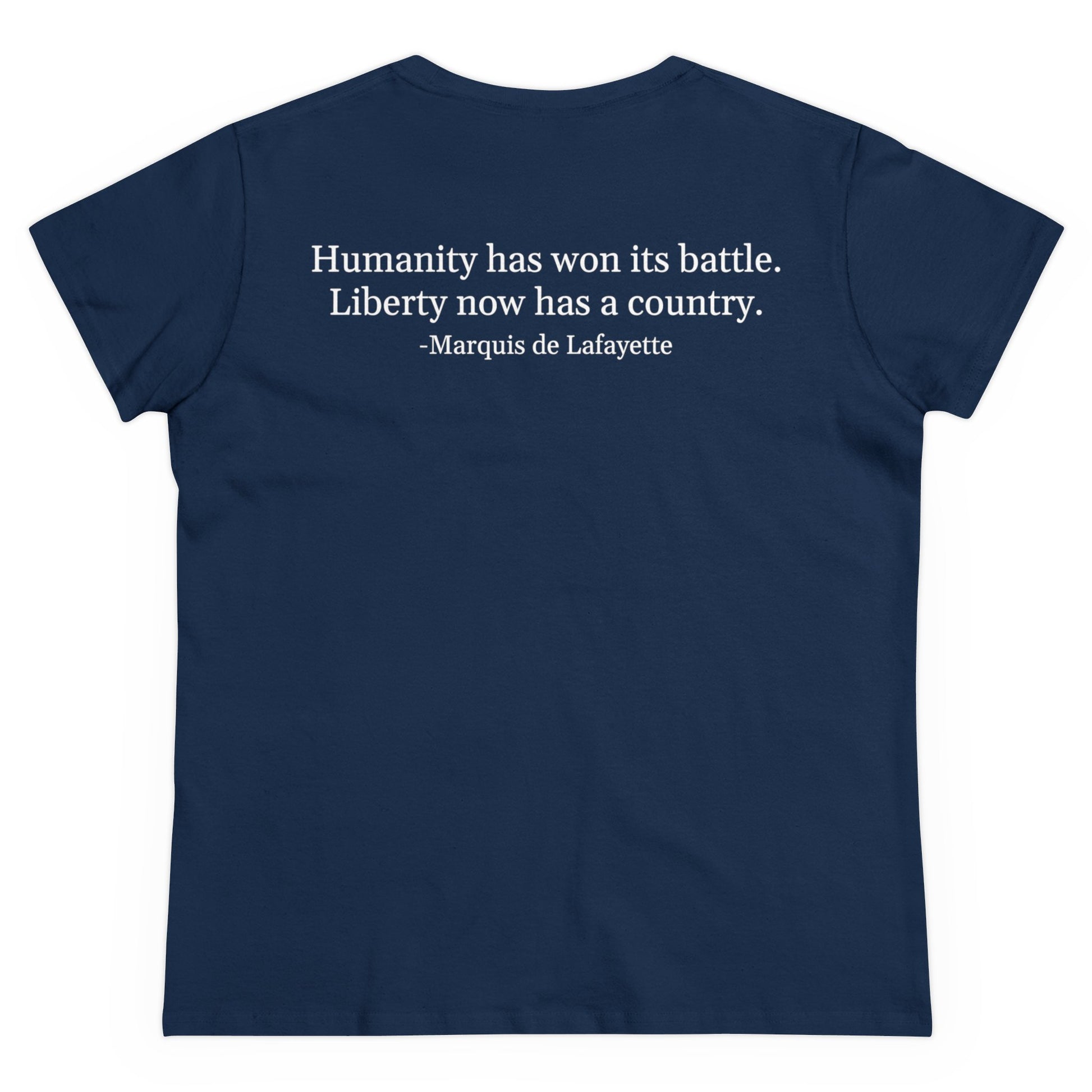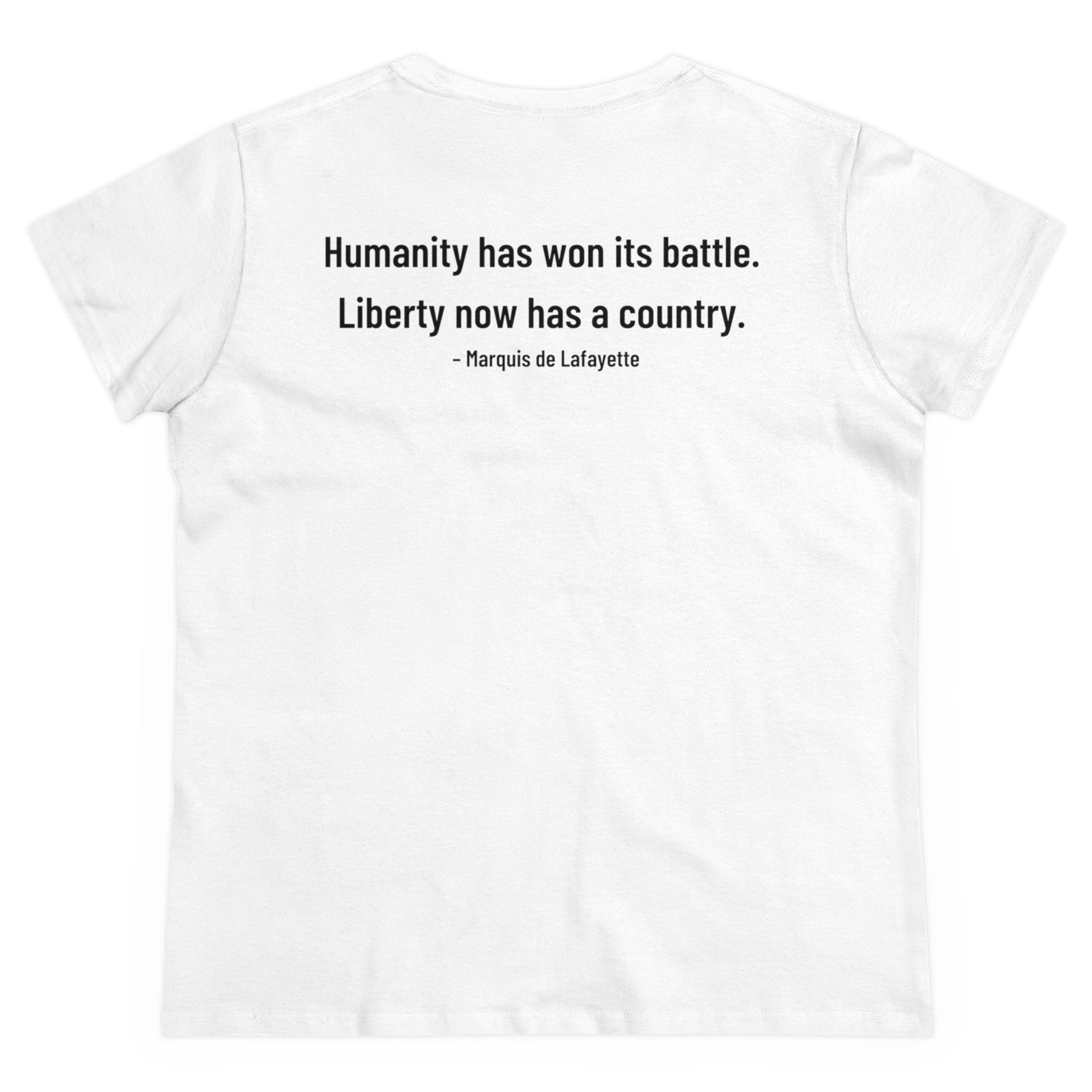 Two-sided Lafayette Women's Tee Silhouette Signature Cap Sleeves Midweight Cotton - Slightly Fitted - Quote on Back, Bicentennial, Marquis