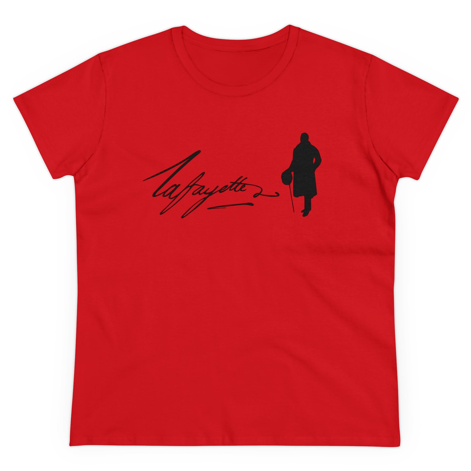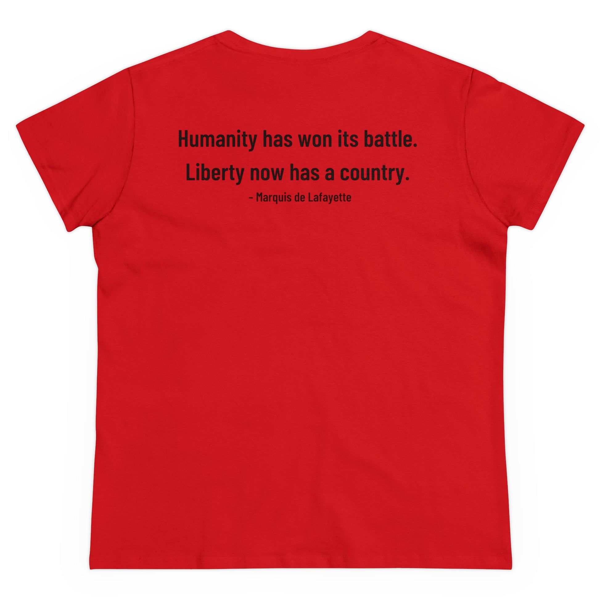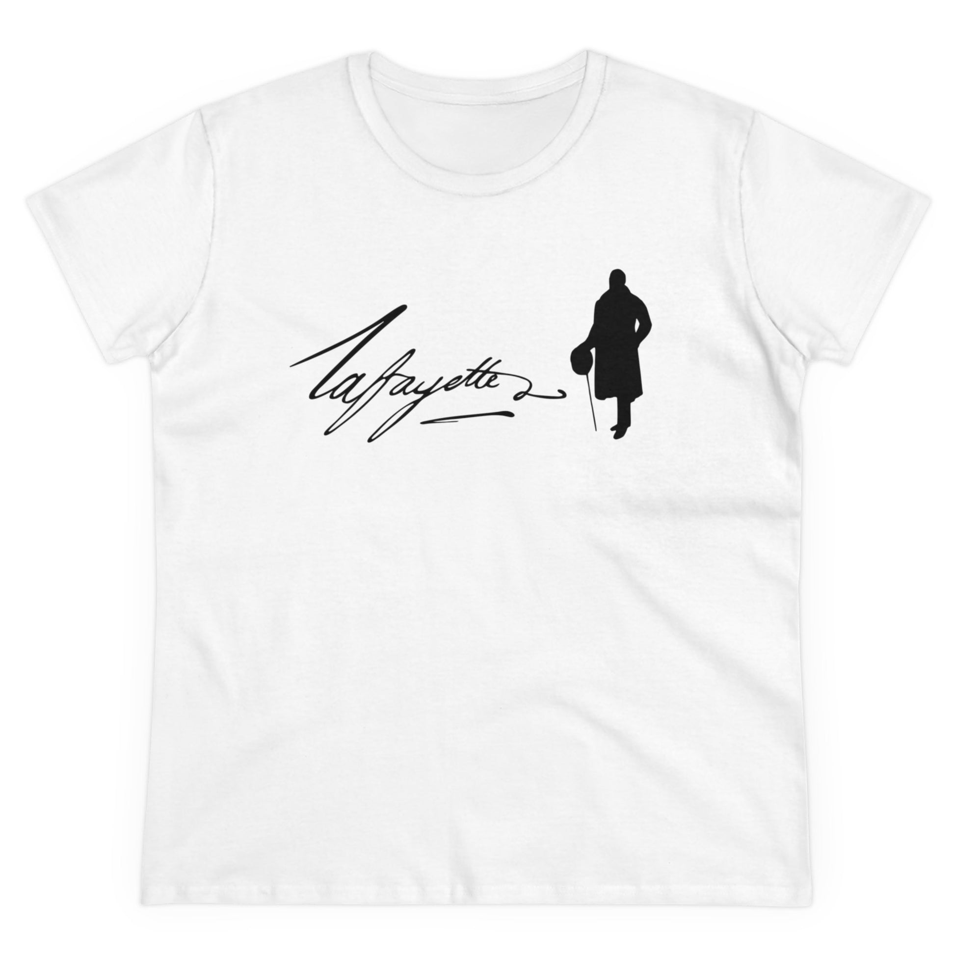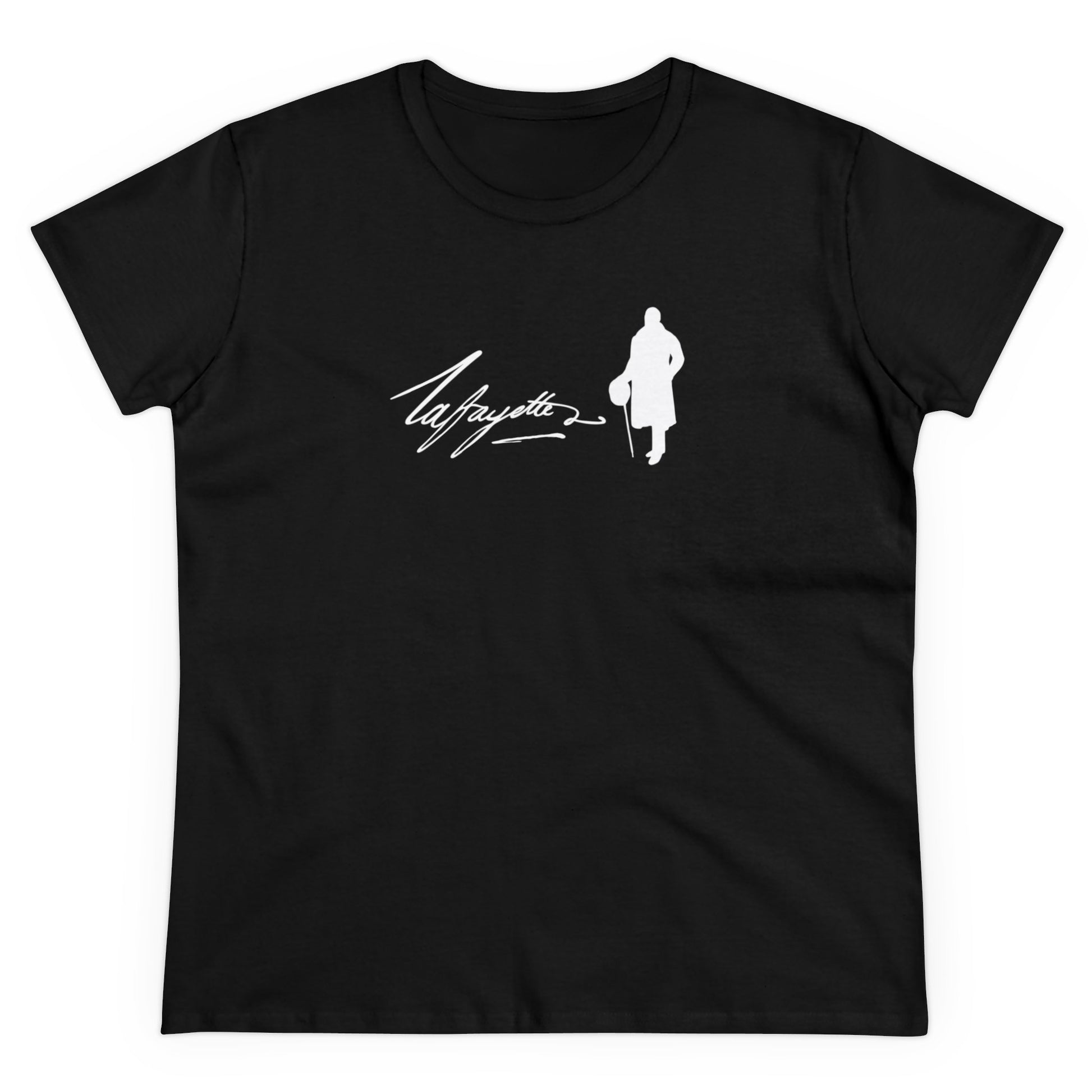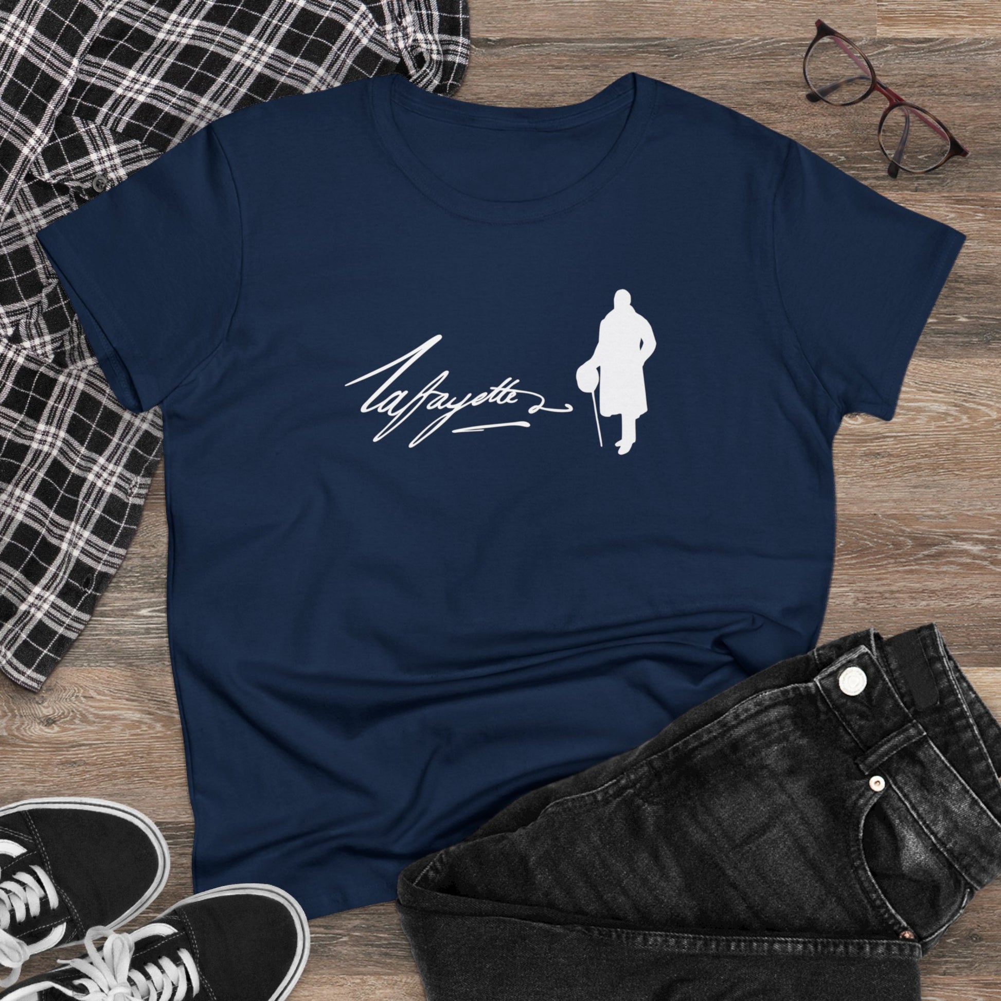 Two-sided Lafayette Women's Tee Silhouette Signature Cap Sleeves Midweight Cotton - Slightly Fitted - Quote on Back, Bicentennial, Marquis