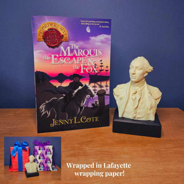 This combo comes with Jenny L. Cote's young adult historical fiction book and a souvenir bust of Lafayette.